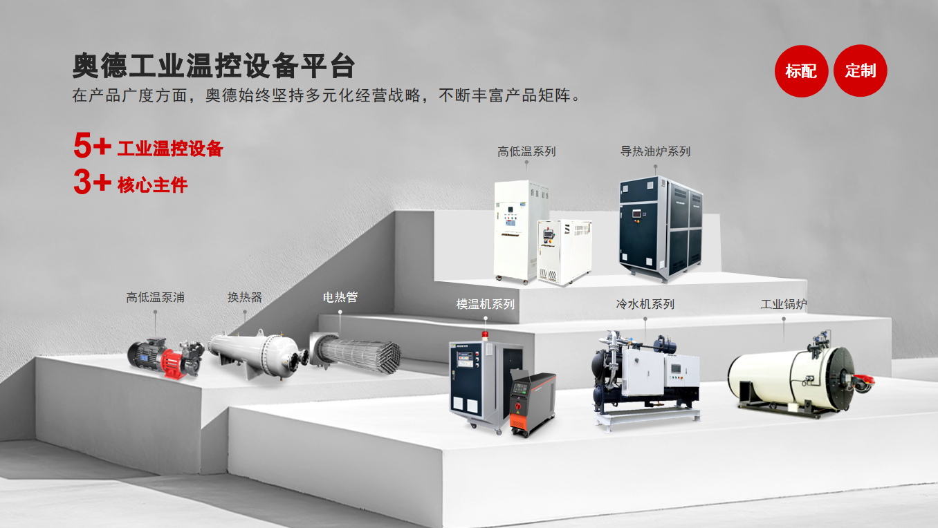 奧德已形成模溫機(jī)、冷水機(jī)、高低溫系列、TCU、鍋爐、泵浦、換熱器等九大產(chǎn)品品類,能夠?yàn)椴煌袠I(yè)提供標(biāo)準(zhǔn)化及定制化的溫度控制解決方案,滿足從常規(guī)生產(chǎn)到極端環(huán)境的精準(zhǔn)控溫需求。
